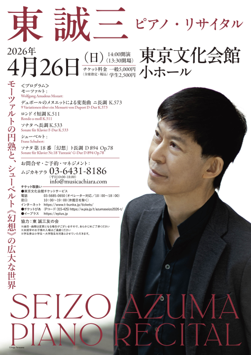 - 東誠三さんの最新の演奏会スケジュール表がアップデートされました。 本ページ下の2つ目のBOXをご覧ください。またこの部分をクリックしますと、直近の10月5日のベートヴェンのピアノ協奏曲「皇帝」、10月12日の藝大プロジェクト2024のチラシのページに飛ぶことが出来ます。